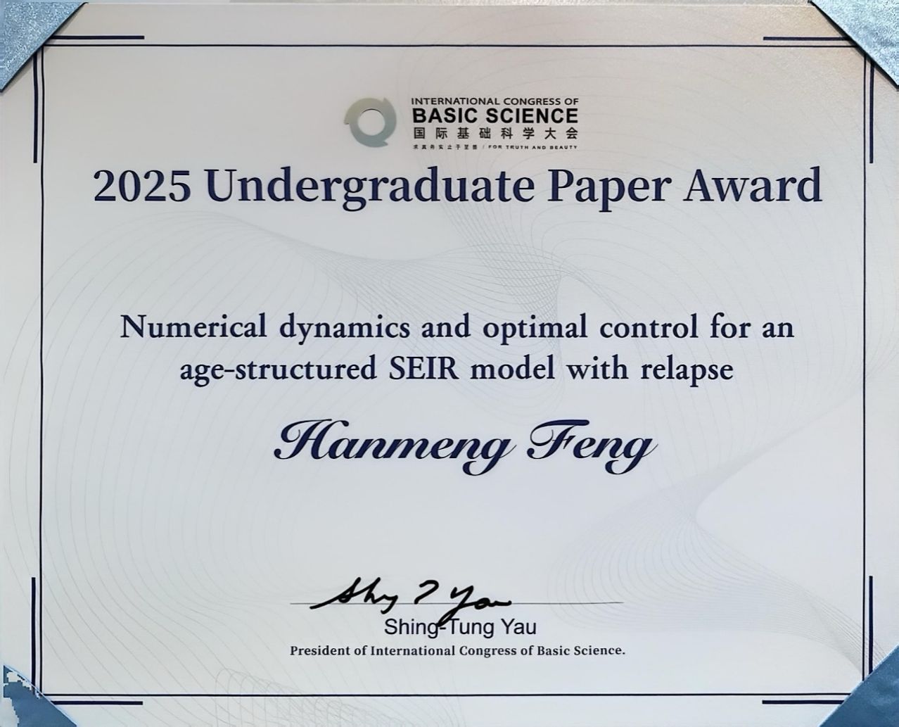 The 2025 International Congress of Basic Science (ICBS) was recently held in Beijing. Hanmeng Feng, an undergraduate student from the Class of 2021 in the School of Mathematical Sciences, received the prestigious ICBS Undergraduate Paper Award for her paper titled “Numerical Dynamics and Optimal Control for an Age-Structured SEIR Model with Relapse”.